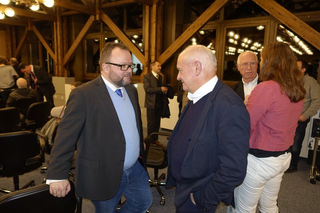 Aufeinandertreffen der OB-Kandidaten (von links): OB Martin Wolff, Aaron Treut, Moderator Gerhard Meier-Röhn sowie Heinz-Peter Schwertges und Andreas Leiling. swiz