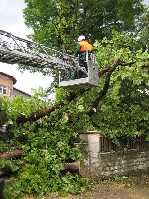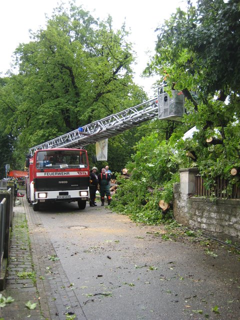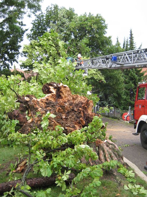 (ch) Bei einem Unwetter mit Regengüssen und teils starken Windböen ist am Freitagabend im Brettener Stadtpark ein Baum umgestürzt. Einige Äste landeten auf dem Promenadenweg. Die alarmierte Feuerwehrabteilung der Brettener Kernstadt war mit vier Fahrzeugen vor Ort und machte sich umgehend daran, die auf den Fußweg zwischen Sporgassenparkplatz und Park gefallenen Baumteile zu entfernen. Beschädigte Äste an angrenzenden Bäumen wurden mit Hilfe der Drehleiter abgetrennt und der Park aus...