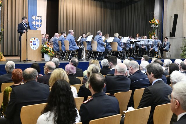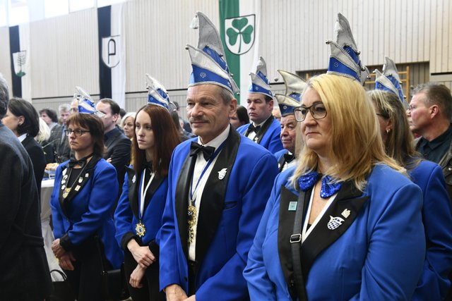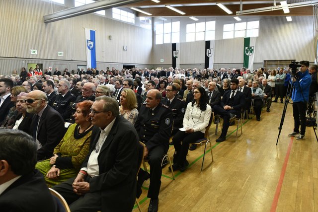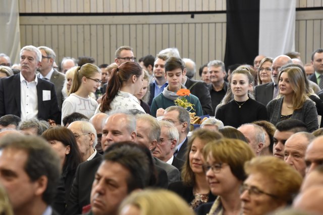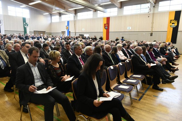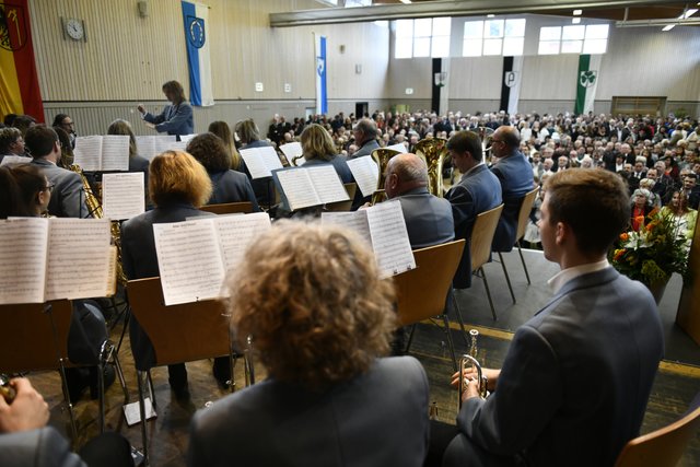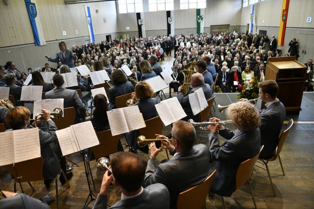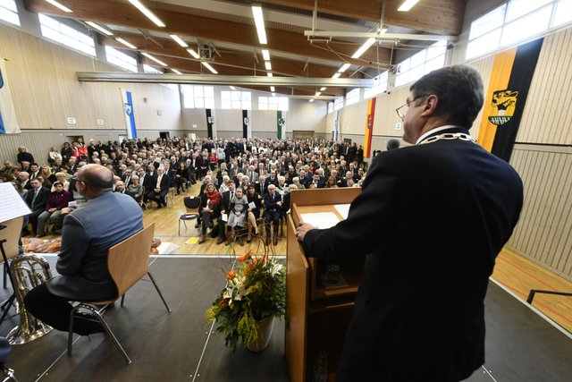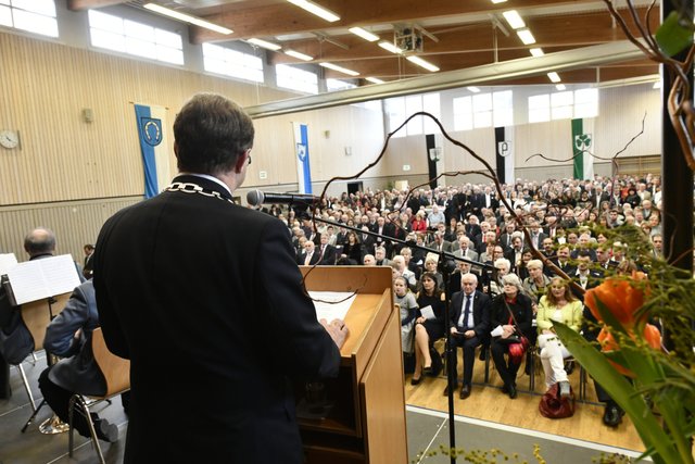 Rund 600 Brettener füllten die Stadtparkhalle am Sonntag beim städtischen Neujahrsempfang. OB Martin Wolf (am Pult) blickte in seiner Rede insbesondere nach vorne. (alle Fotos: wod)